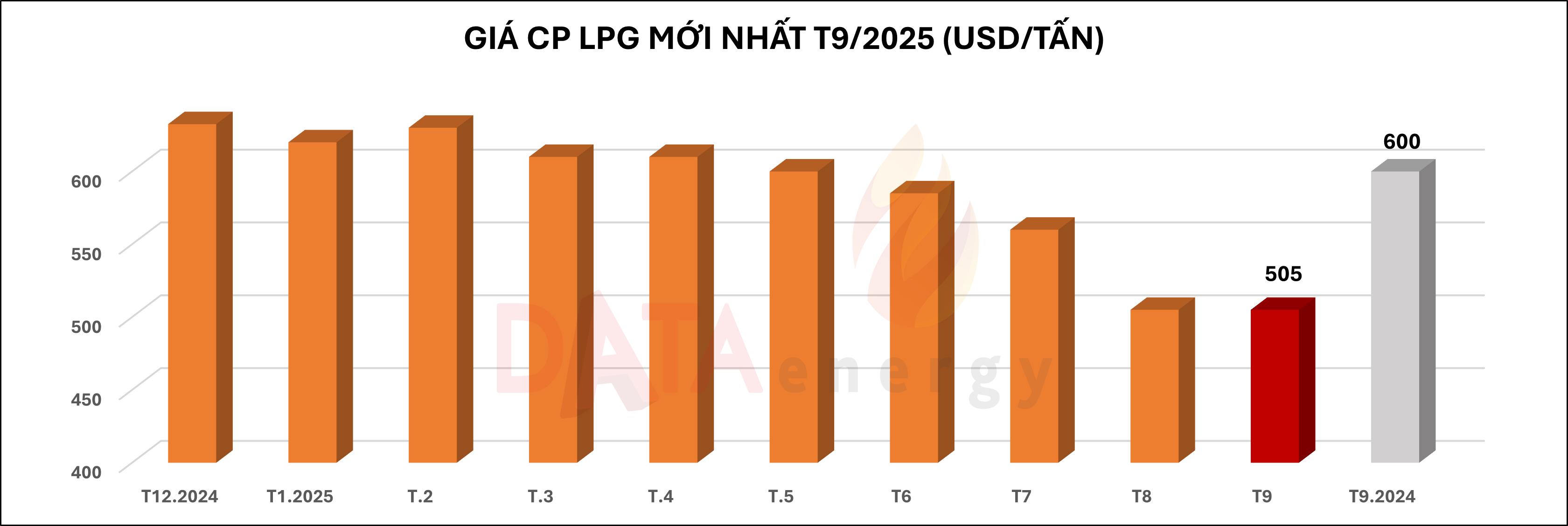 Giá CP LPG tháng 9/2025 giảm 95 USD so với cùng kỳ năm ngoái (giá gas - CP LPG tháng 9/2024 đạt: 600 USD/tấn).